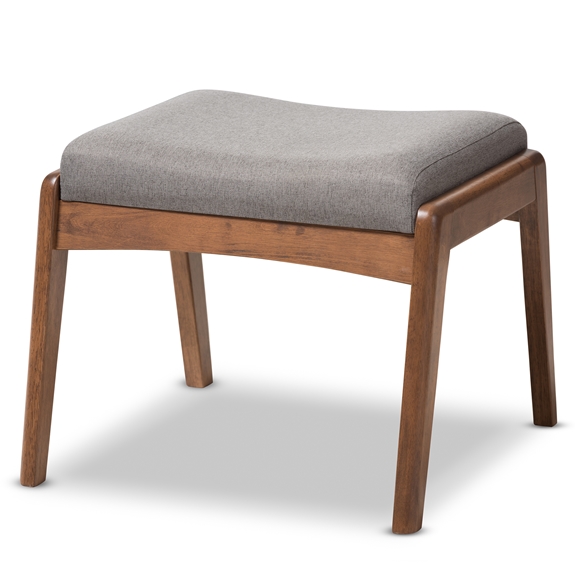 Inspired by the Danish designs, the Roxy upholstered footstool is the perfect accompaniment to the Roxy high-back lounge chair, providing additional comfort to the elegant piece. Crafted of solid rubberwood in dark walnut finishing with grey fabric upholstery, a sophisticated look of the ottoman is formed. Featuring a concaved design in the middle of the ottoman, the Roxy promotes ultimate relaxation. Durable and functional, the piece reflects the Danish design principles of simple form and practical structure. Made in Malaysia, the Roxy ottoman requires assembly.Features:Mid-century ottomanFabric upholsteredWalnut brown finishing wood frameButton-tufting design on the high-back seatAssembly requiredMade in Malaysia-Natural raw materials used for construction of our furnishings will have variations in areas such as (but not limited to) color, pattern, grain and texture. This includes substances such as wood and leather. These variations may appear in different surfaces of a single item, an area of a product when compared with that same area on an identical product, or on differing surfaces of different pieces of a matching set.